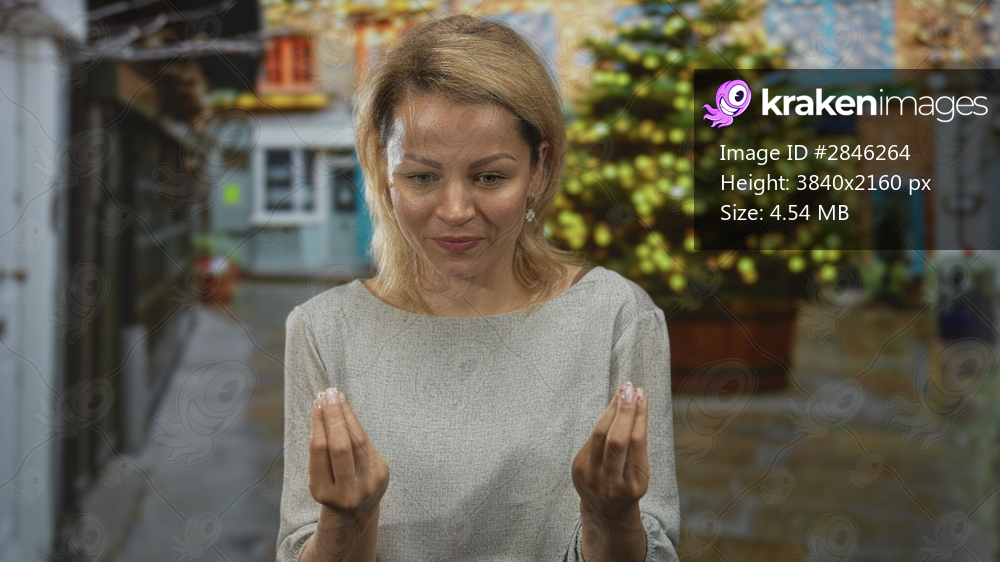 Young blonde woman in grey blouse gestures pinched fingers with both hands on urban street; impatience.
