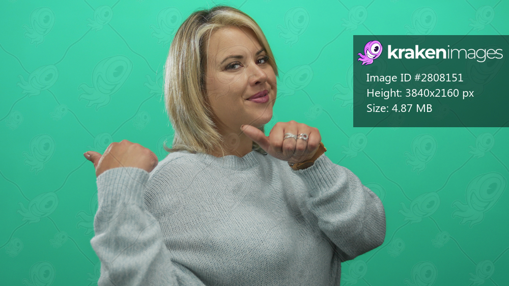 Young blonde woman in grey sweater smiling and pointing thumb to self in studio; confidence empowerment positivity boldness.