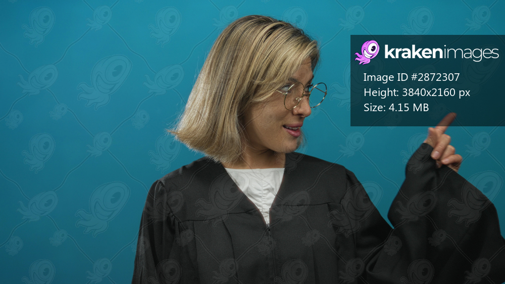 Young blonde woman in judge robe points finger to side and makes ok sign with hand in teal studio; approval confidence.