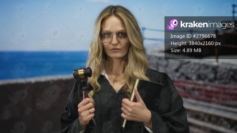 Young blonde woman in judge uniform with gavel stands outdoors on seaside promenade.
