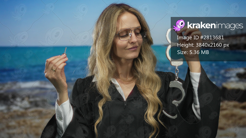 Young blonde woman in judge uniform holding handcuffs and key on beach, ocean backdrop creates unique outdoor justice theme.