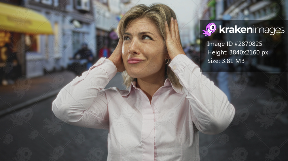 Young blonde woman in light pink blouse covers ears with hands on crowded city street during daytime; frustration.