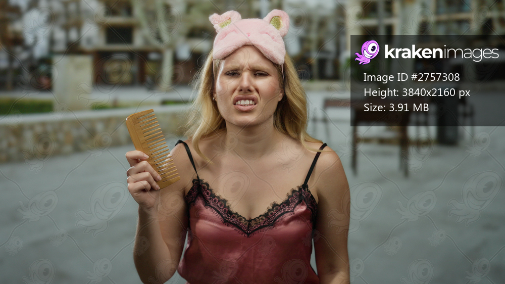 Young blonde woman in nightwear with eye mask holding brush on city street outdoors expressing frustration.