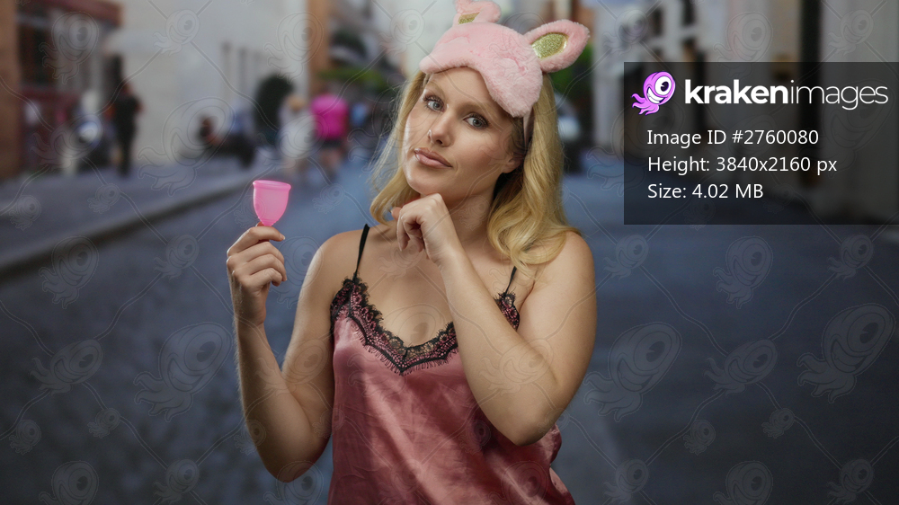 Young blonde woman in nightwear holding a menstrual cup on a city street with a thoughtful expression and a whimsical sleep mask.