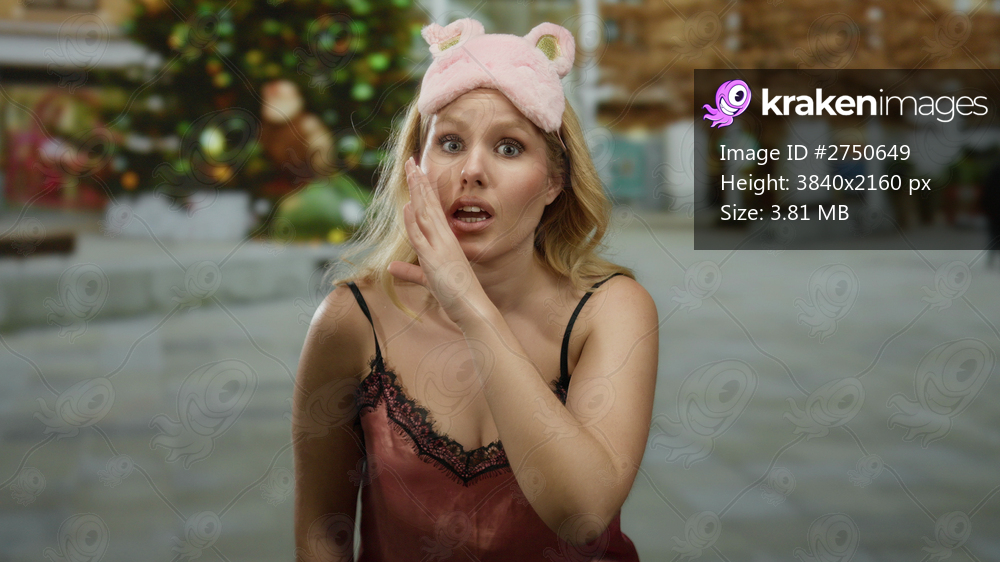 Young blonde woman in nightwear making a secret gesture on a city street during the night with a playful expression and festive decorations in the background.