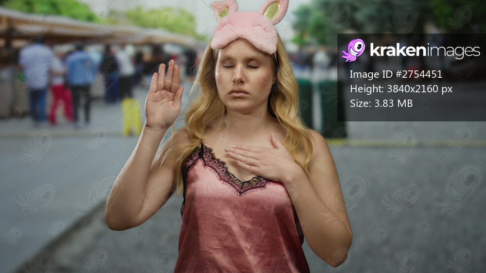 Young blonde woman in nightwear stands on a busy city street, wearing a pink eye mask and adopting a pledge gesture amidst a blurred urban crowd.