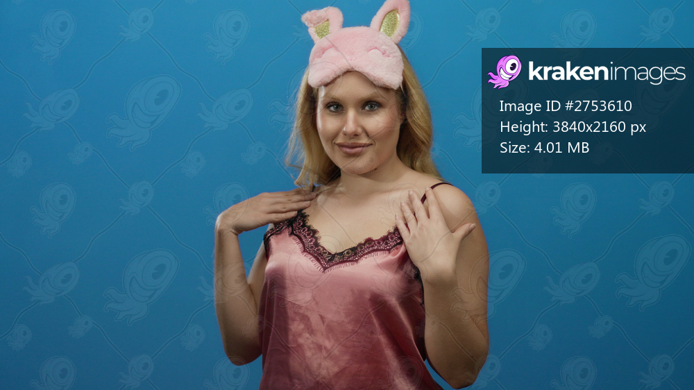 Young blonde woman in pink nightwear and bunny eye mask posing against a blue background, exuding playfulness and relaxation.