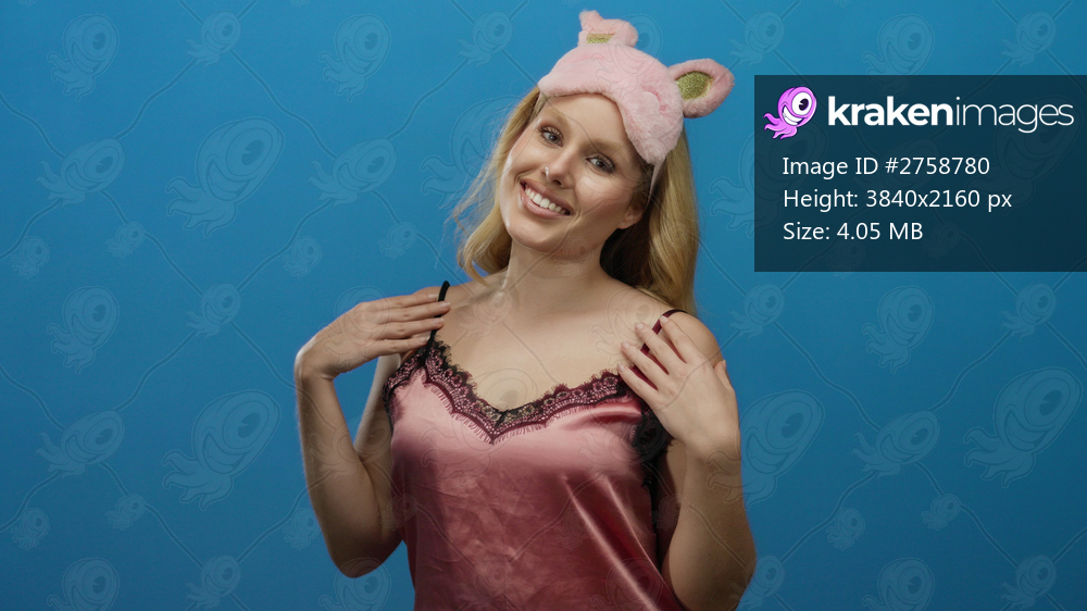 Young blonde woman in pink nightwear and bunny eye mask posing against a blue background, exuding playfulness and relaxation.