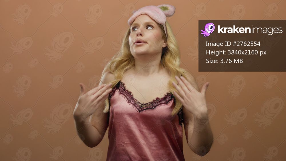 Young blonde woman in pink nightwear cooling off against an orange background, wearing a playful sleep mask and gesturing with her hands.