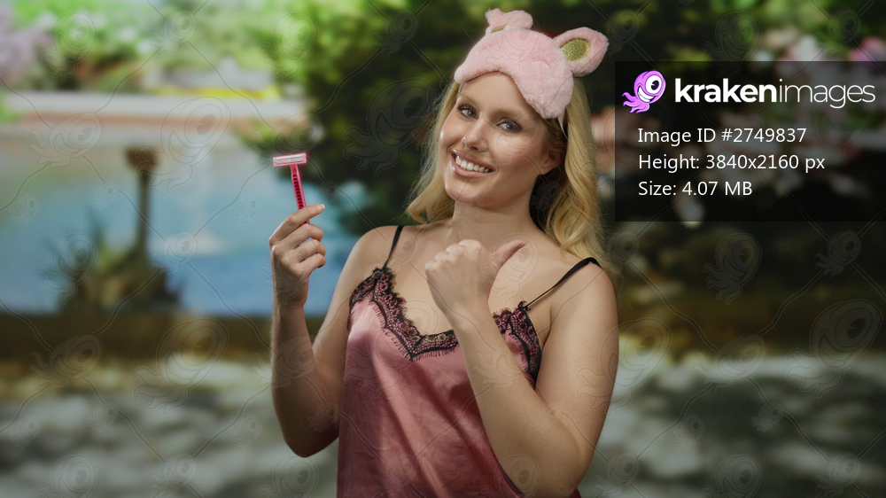Young blonde woman in pink nightwear holding razor outdoors on promenade with beach in background, smiling during sunny day