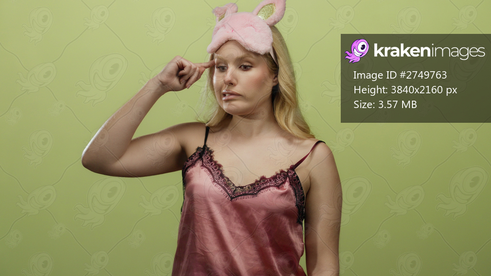 Young blonde woman in pink nightwear makes a playful crazy gesture against a yellow background, showcasing fun and whimsical bedtime moments in a cozy setting. - Kraken Images
