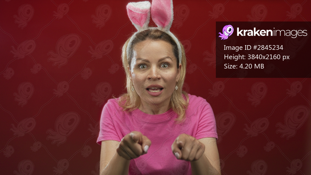 Young blonde woman in pink shirt and bunny ears headband points finger forward in red studio; surprise.