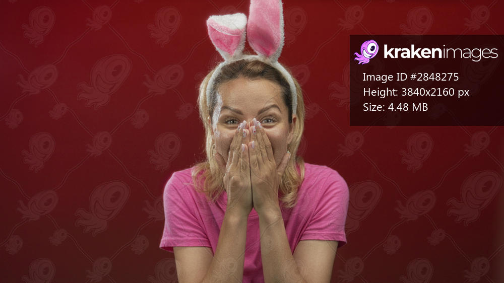 Young blonde woman in pink shirt and bunny ears headband points finger forward in red studio; surprise.