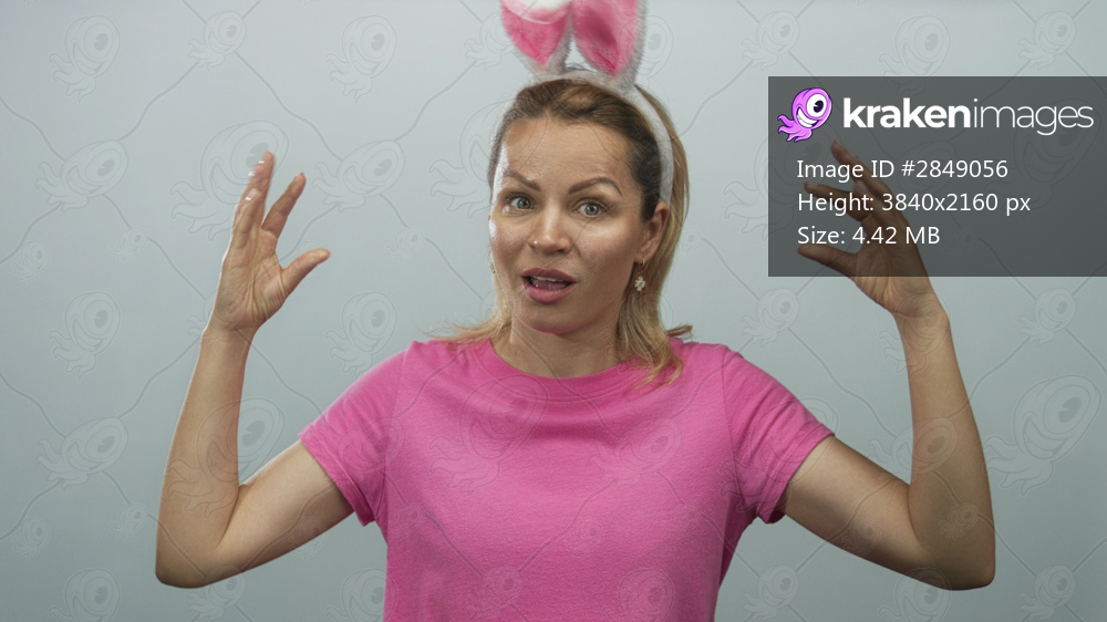 Young blonde woman in pink shirt gestures with hands and wears bunny ears headband in grey studio; confusion.