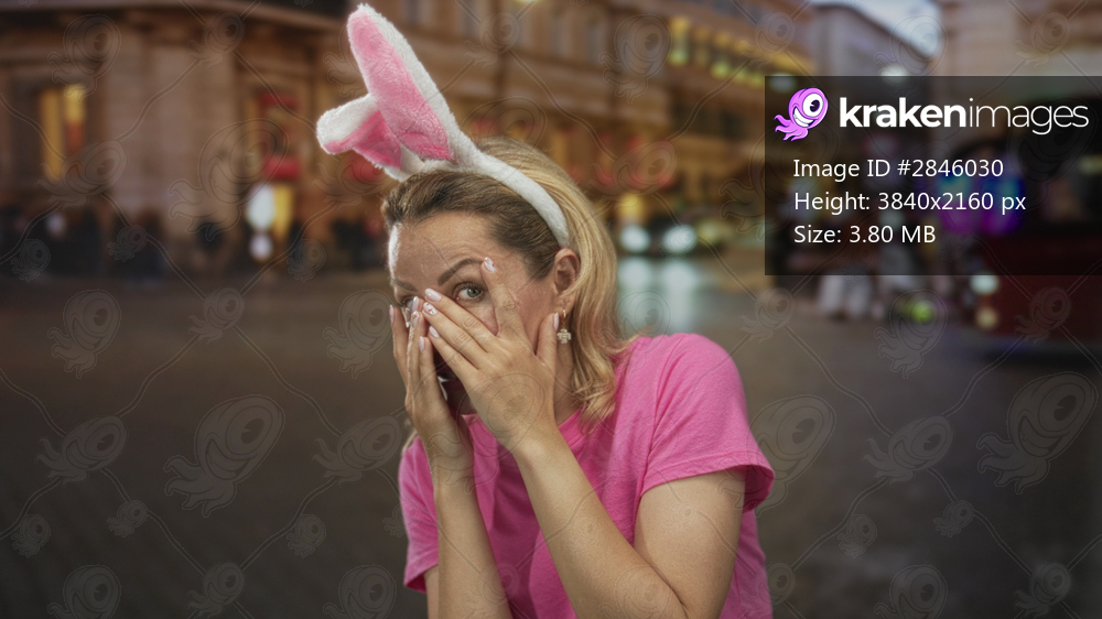 Young blonde woman in pink shirt with headband covers face with hands under neon lights on city street; embarrassment.