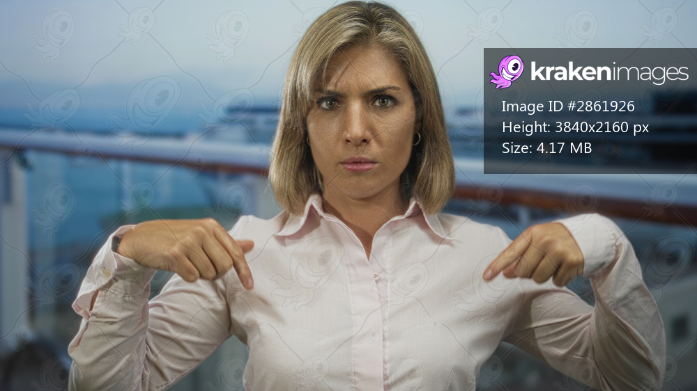 Young blonde woman in pink shirt with serious expression points finger to chest in building; defiance pride honor courage.