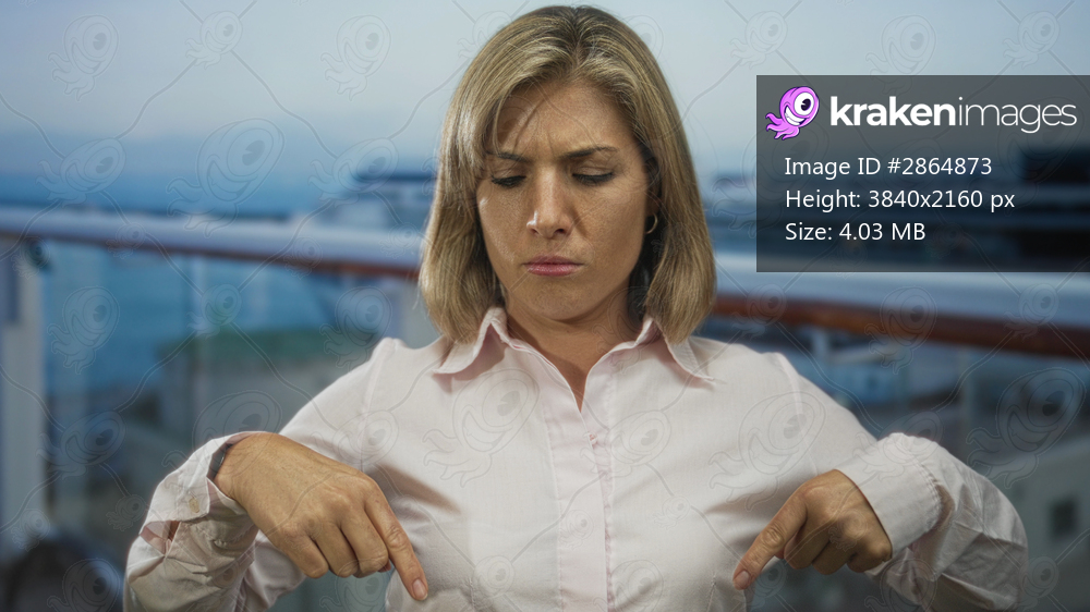 Young blonde woman in pink shirt with serious expression points finger to chest in building; defiance pride honor courage.