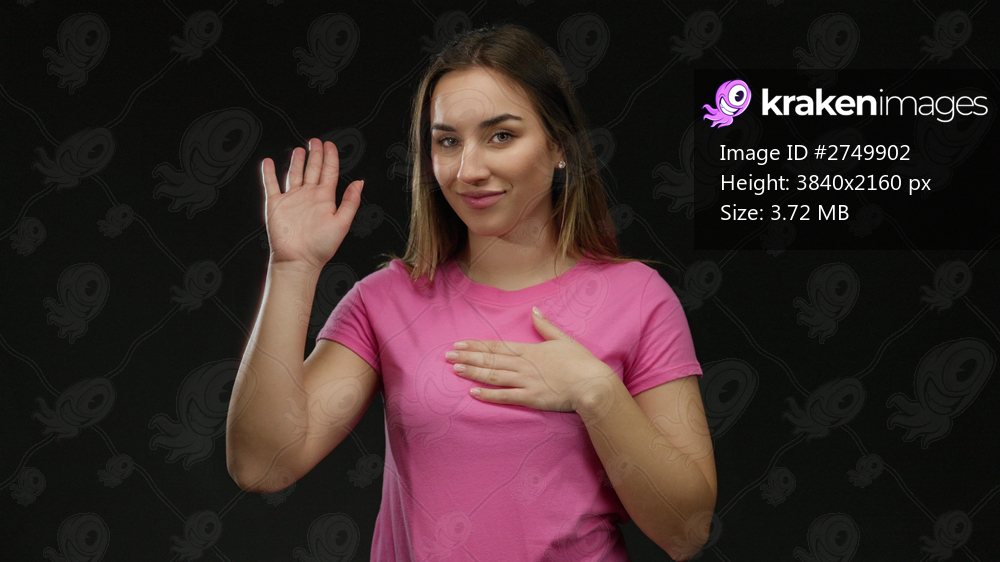 Young blonde woman in pink shirt taking an oath against an isolated black background in a gesture of sincerity and commitment.