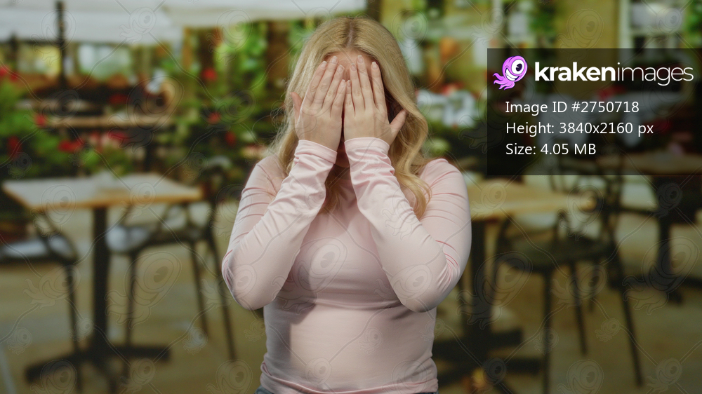 Young blonde woman in pink top playfully covers her face and smiles at a restaurant with outdoor tables and vibrant foliage.