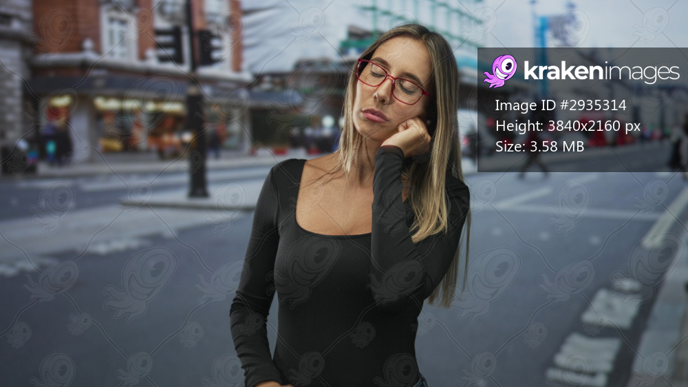 Young blonde woman in red glasses with hand on cheek and exposed shoulder at a city street crosswalk, candid pose and blurred urban traffic in background; contemplation. - Kraken Images