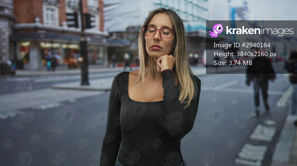 Young blonde woman in red glasses with hand on cheek and exposed shoulder at a city street crosswalk, candid pose and blurred urban traffic in background; contemplation. - Kraken Images