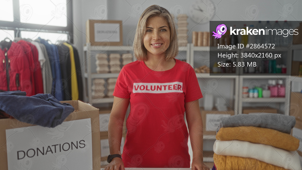 Young blonde woman in red shirt at donation center building gives thumbs up gesture; charity kindness hope.