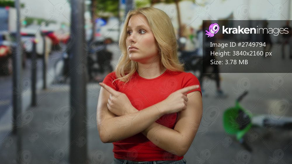 Young blonde woman in red shirt gesturing on busy city street with blurred pedestrians and bicycles in the background, expressing directions outdoors.