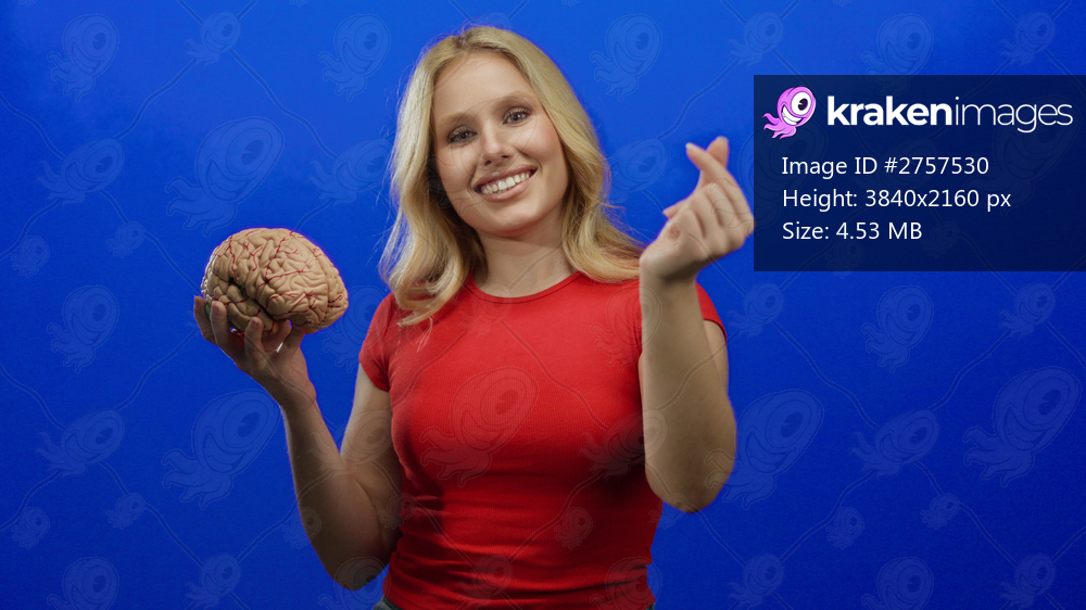 Young blonde woman in red shirt holding brain model against blue background, making finger heart gesture with a smile, conveying intelligence and positivity. - Kraken Images