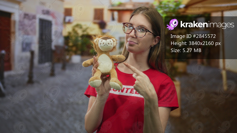 Young blonde woman in red volunteer shirt points finger to plush toy on cobblestone street plaza; compassion support.