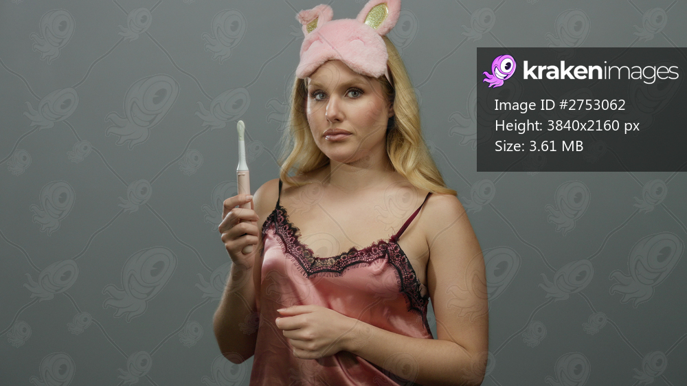 Young blonde woman in sleepwear holding toothbrush against grey background wearing pink sleep mask and examining toothbrush closely