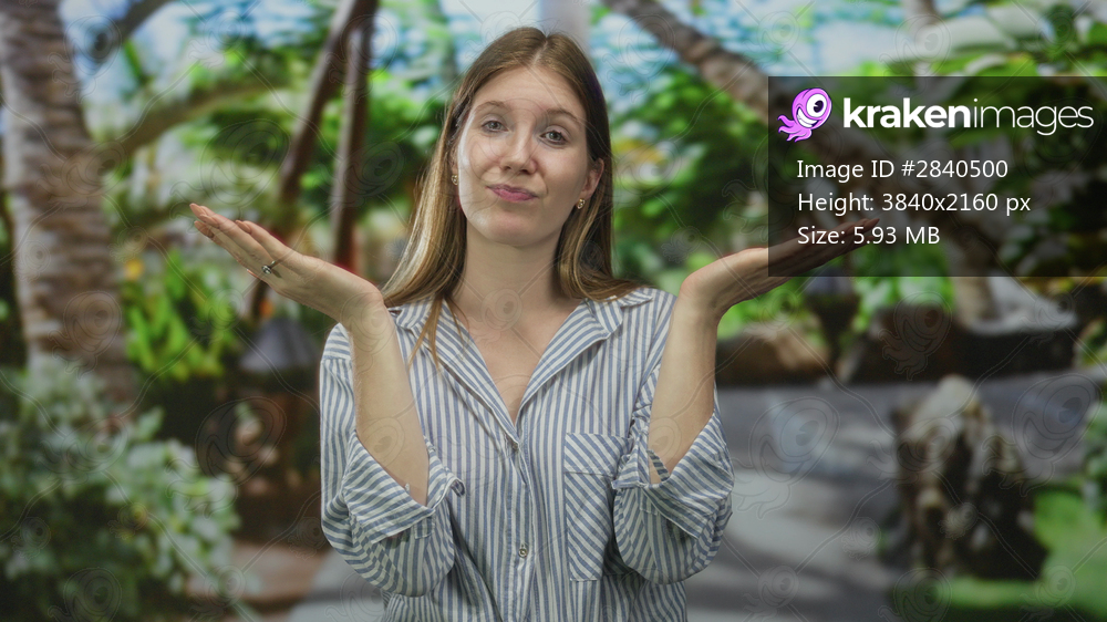 Young blonde woman in striped shirt shrugs shoulders with open palms in lush green park; uncertainty.