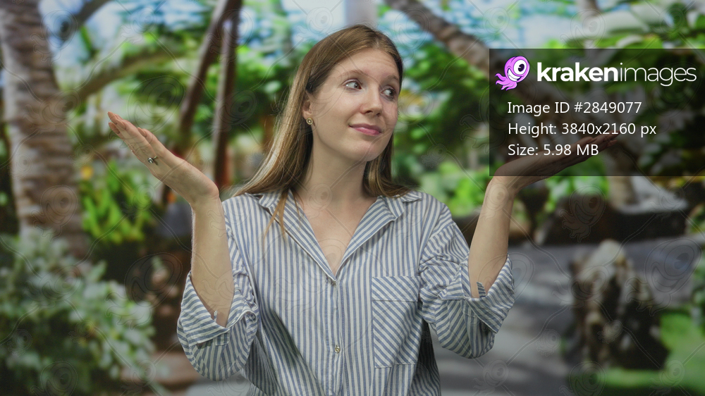 Young blonde woman in striped shirt shrugs shoulders with open palms in lush green park; uncertainty.