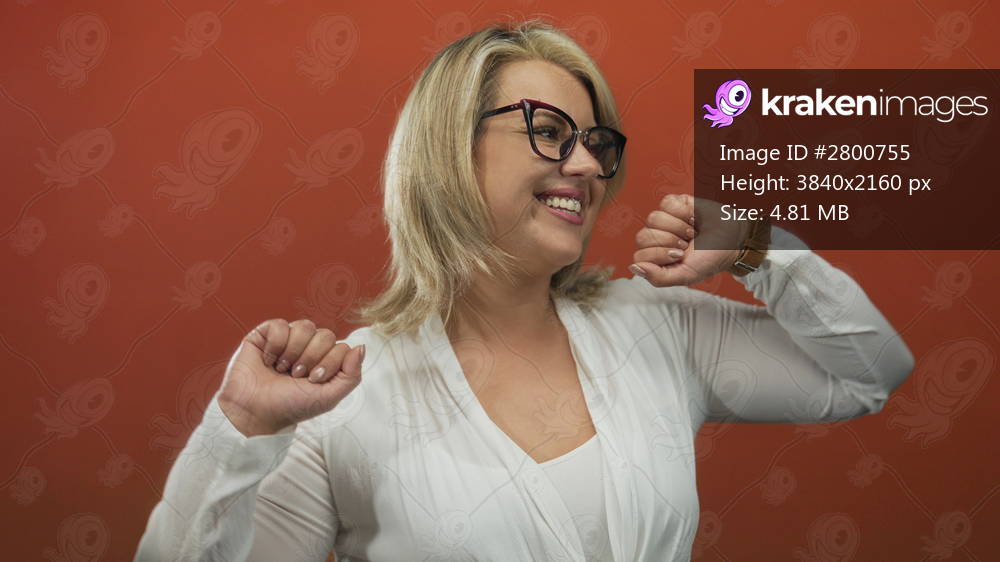 Young blonde woman in white blouse with glasses raising fists and smiling in studio against orange background; joy.