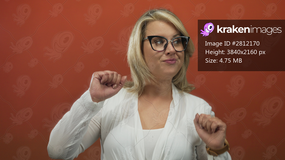 Young blonde woman in white blouse with glasses raising fists and smiling in studio against orange background; joy.