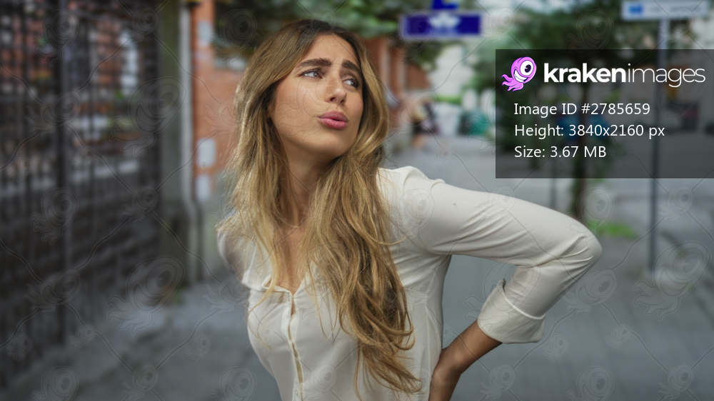 Young blonde woman in white blouse holds lower back on cobblestone street; backache discomfort stress pain.