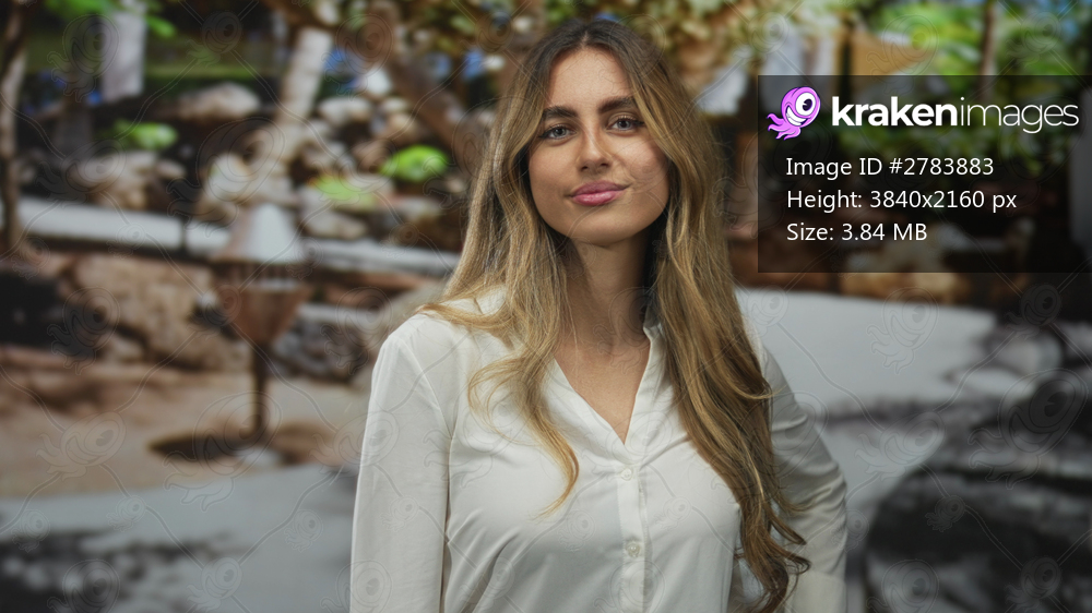 Young blonde woman in white blouse smiles softly while waves hand at camera in garden with blurred foliage behind; attention connection.