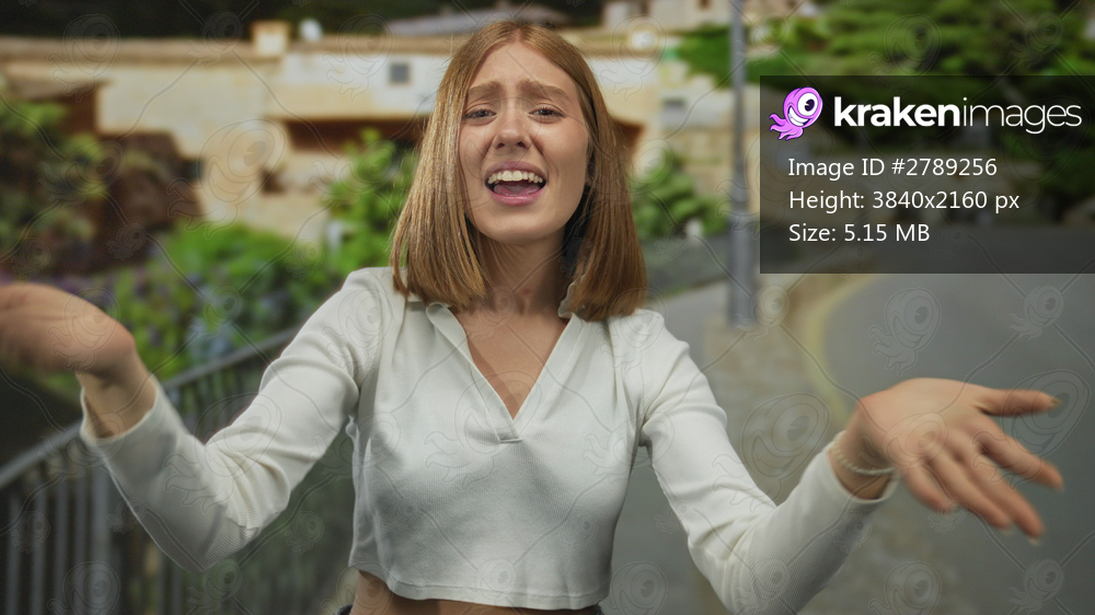Young blonde woman in white crop top bare arms beckons on cobblestone street; urgency plea frustration.