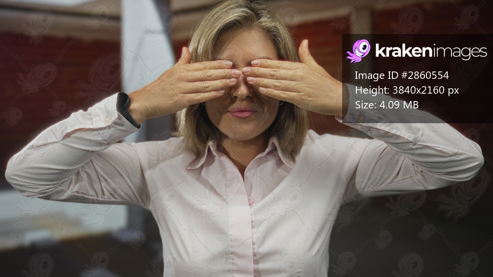 Young blonde woman in white shirt covering eyes and clenching fists inside an unfinished building; excitement.