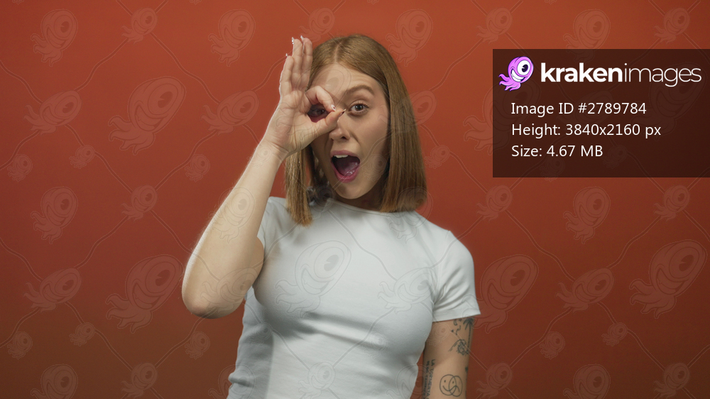Young blonde woman in white shirt gestures playful on isolated red background showcasing tattoos and expression with hand near face