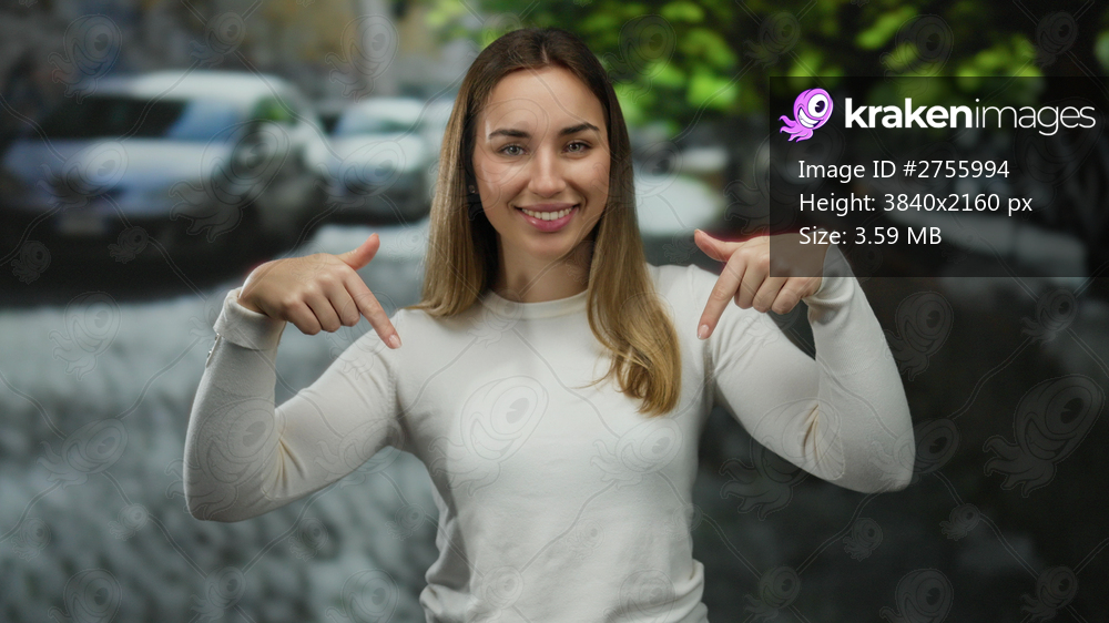 Young blonde woman in white sweater points on street surrounded by parked cars and green trees in outdoor urban setting with a cheerful expression.