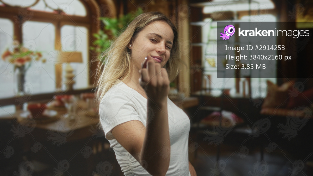 Young blonde woman in white t shirt beckons with fingers in living room, looking directly at camera with a serious expression; challenge.