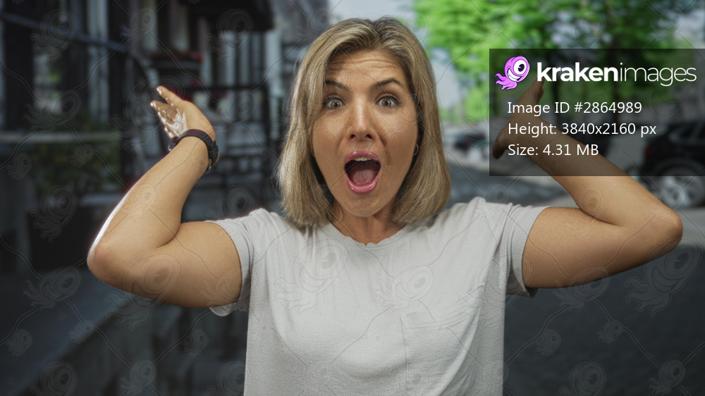 Young blonde woman in white t shirt raising hands on cobblestone street with parked cars behind; surprise.