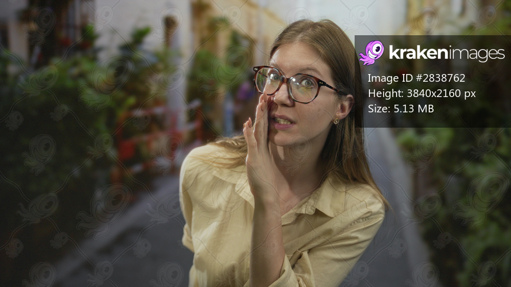 Young blonde woman in yellow shirt with finger to lips for silence on busy street; secrecy reflection.