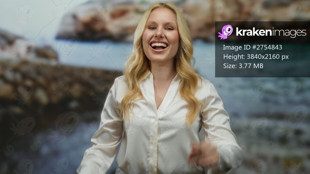 Young blonde woman joyfully laughing at the beach with the sea in the background wearing a white shirt under the sunny sky.
