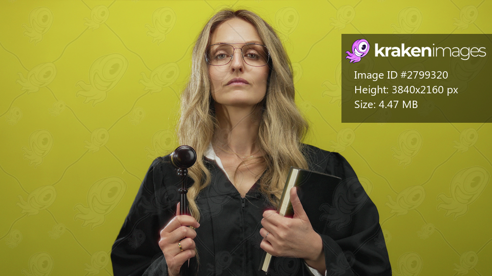 Young blonde woman judge in uniform holds gavel against vibrant yellow background wall isolated indoors law concept