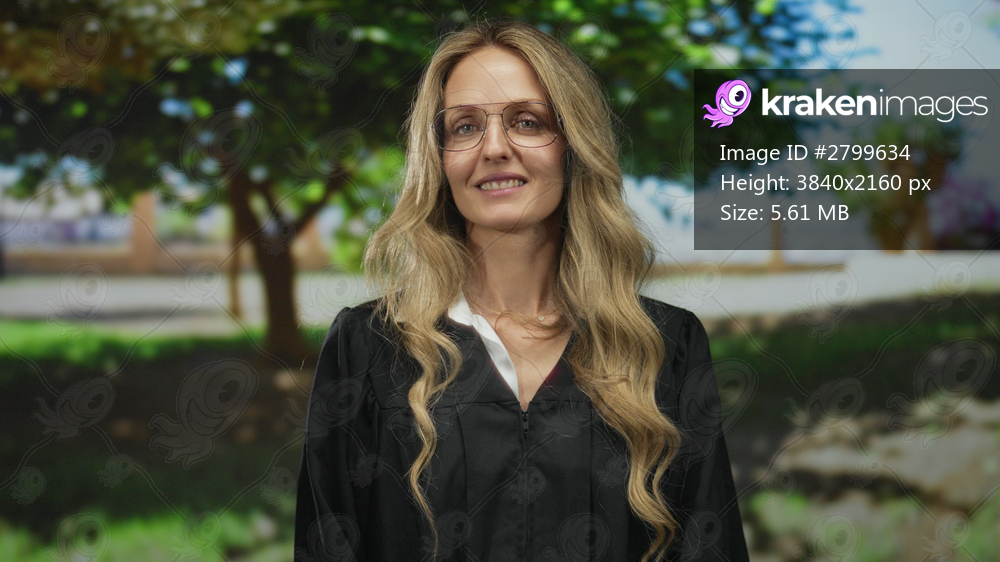 Young blonde woman judge in uniform poses confidently outdoors in a green park surrounded by trees, embodying empowerment and authority in a serene natural setting. - Kraken Images