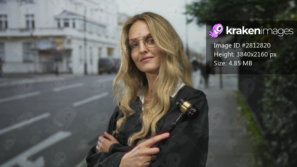 Young blonde woman judge in uniform standing on street outdoors confidently holding gavel in urban area with blurred background
