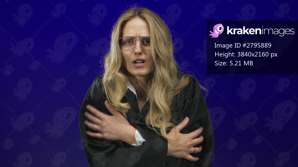 Young blonde woman judge in uniform visibly cold against isolated blue background with arms crossed and eyes closed.
