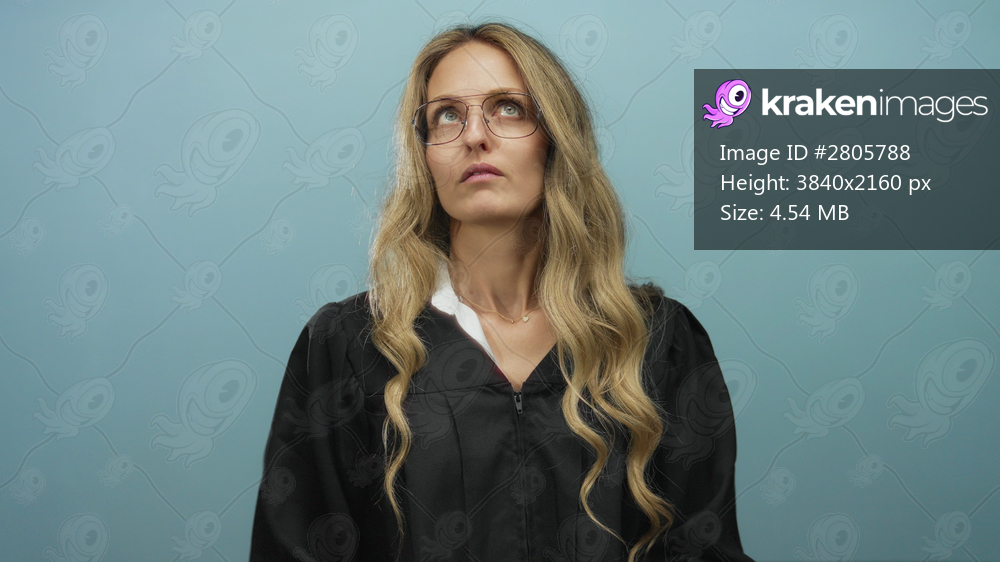 Young blonde woman judge uniform over isolated blue background wall looks frustrated while shrugging her hands near chest in a minimalist studio portrait. - Kraken Images