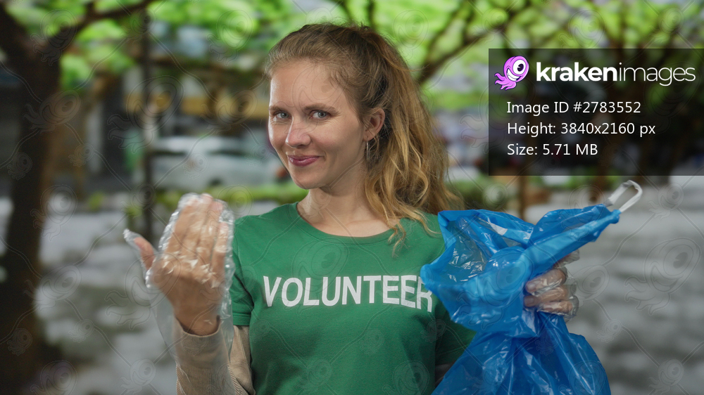 Young blonde woman lifts bag, smiling in park as volunteer wearing gloves cleaning outdoors in green community event.